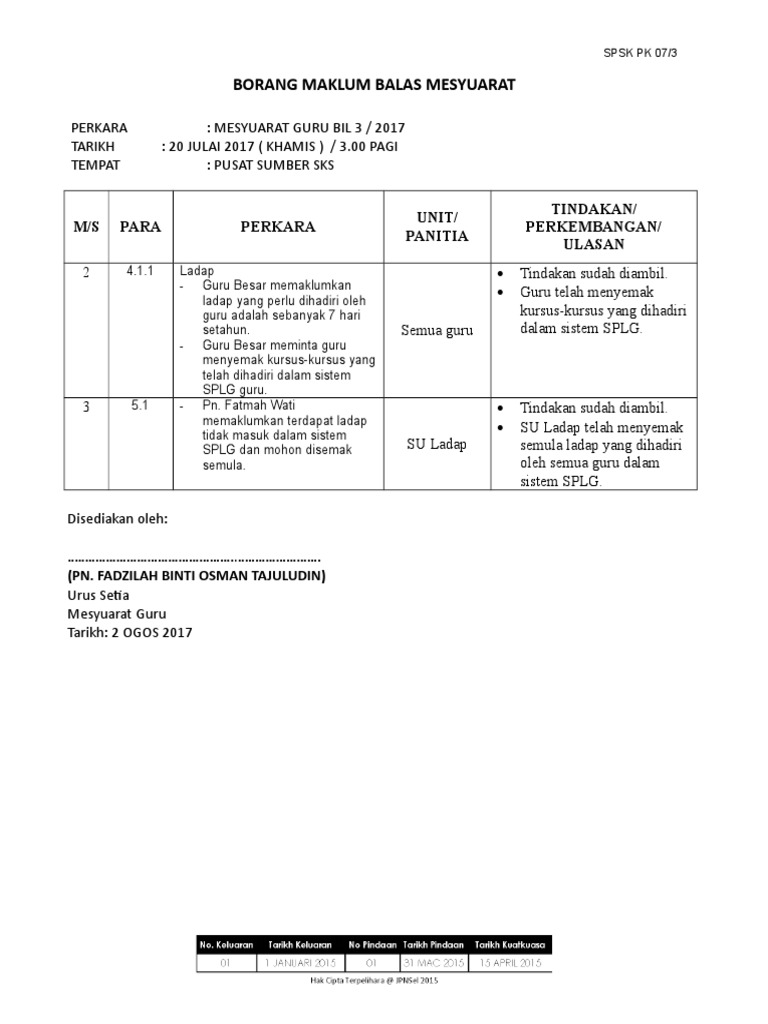 05 borang maklum balas. Program pembangunan sukan. No keluaran tarikh keluaran no pindaan tarikh pindaan tarikh berkuatkuasa 06 01 disember 2016 0 0 3 januari 2017 pk15 1. Pk 07 pengurusan mesyuarat mengendalikan mesyuarat adalah sesuatu yang agak rutin bagi seseorang guru.