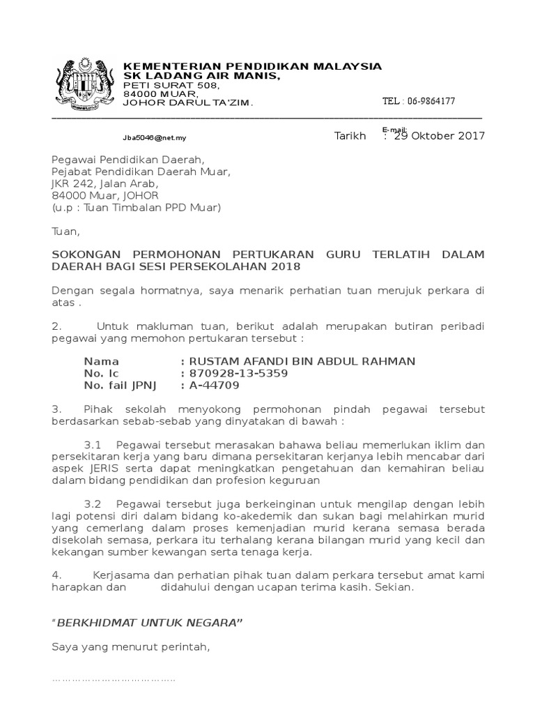 Surat Rasmi Permohonan Pindah Tempat Kerja Rasmi Ri