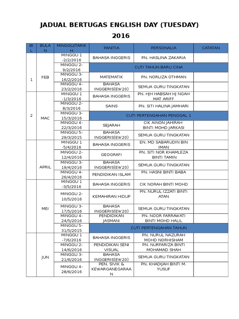 Jadual Bertugas English Day 16