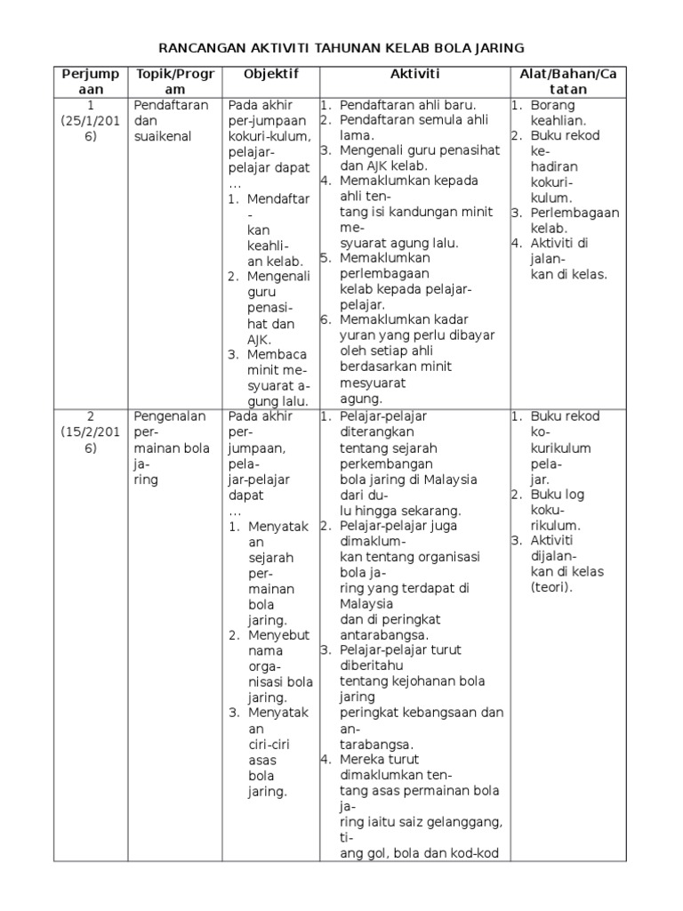 Rancangan Aktiviti Tahunan Kelab Bola Jaring
