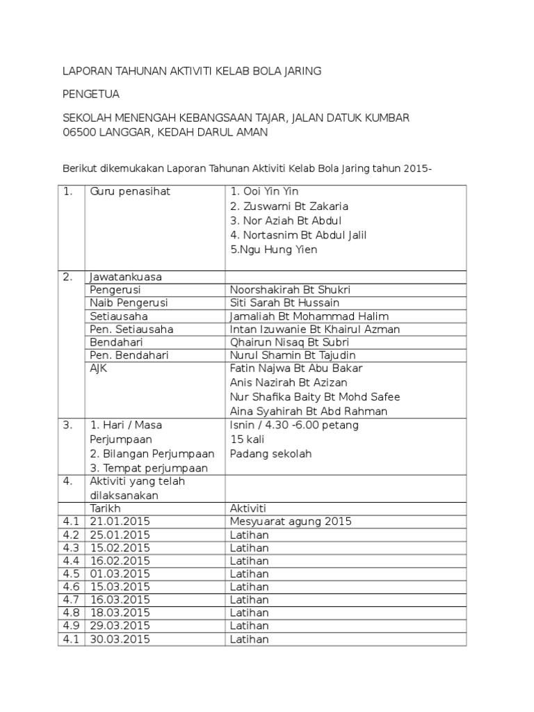 Laporan Tahunan Aktiviti Kelab Bola Jaring