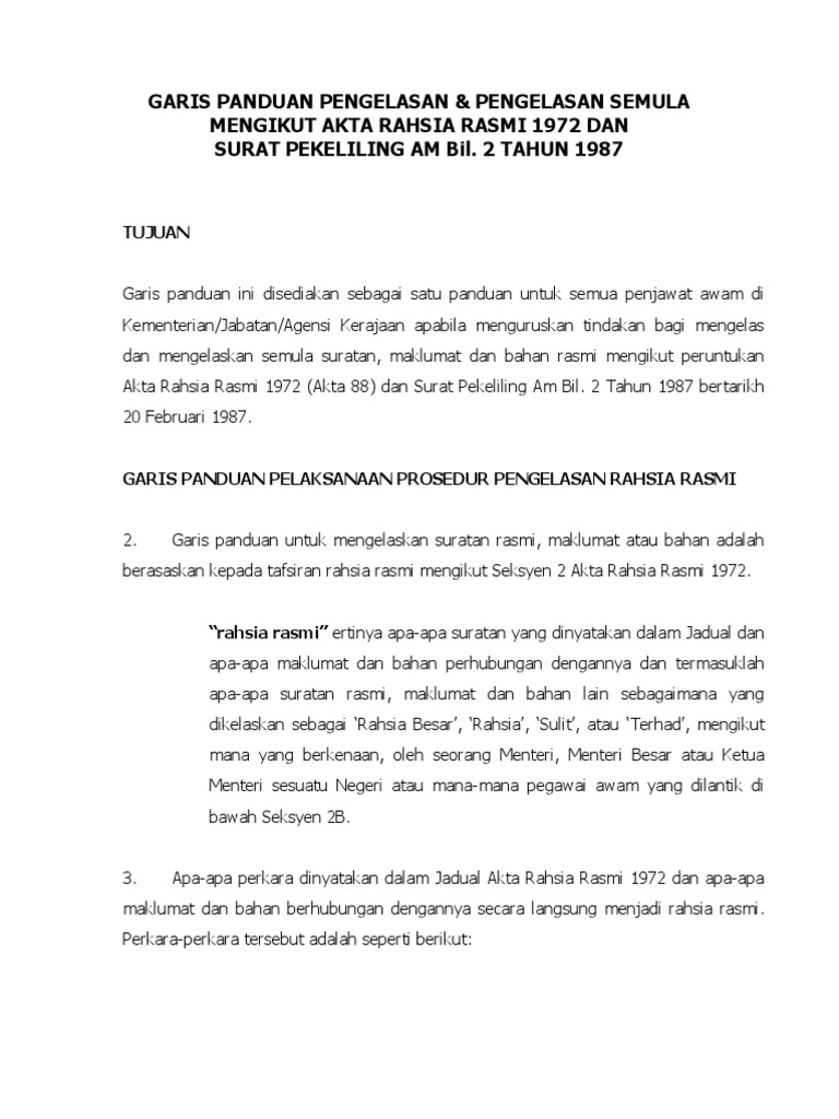 Garis Panduan Pengelasan Dan Pengelasan Semula Mengikut Akta Rahsia Rasmi 1972 Dan Surat Pekeliling Am Bil 2 Tahun 1987